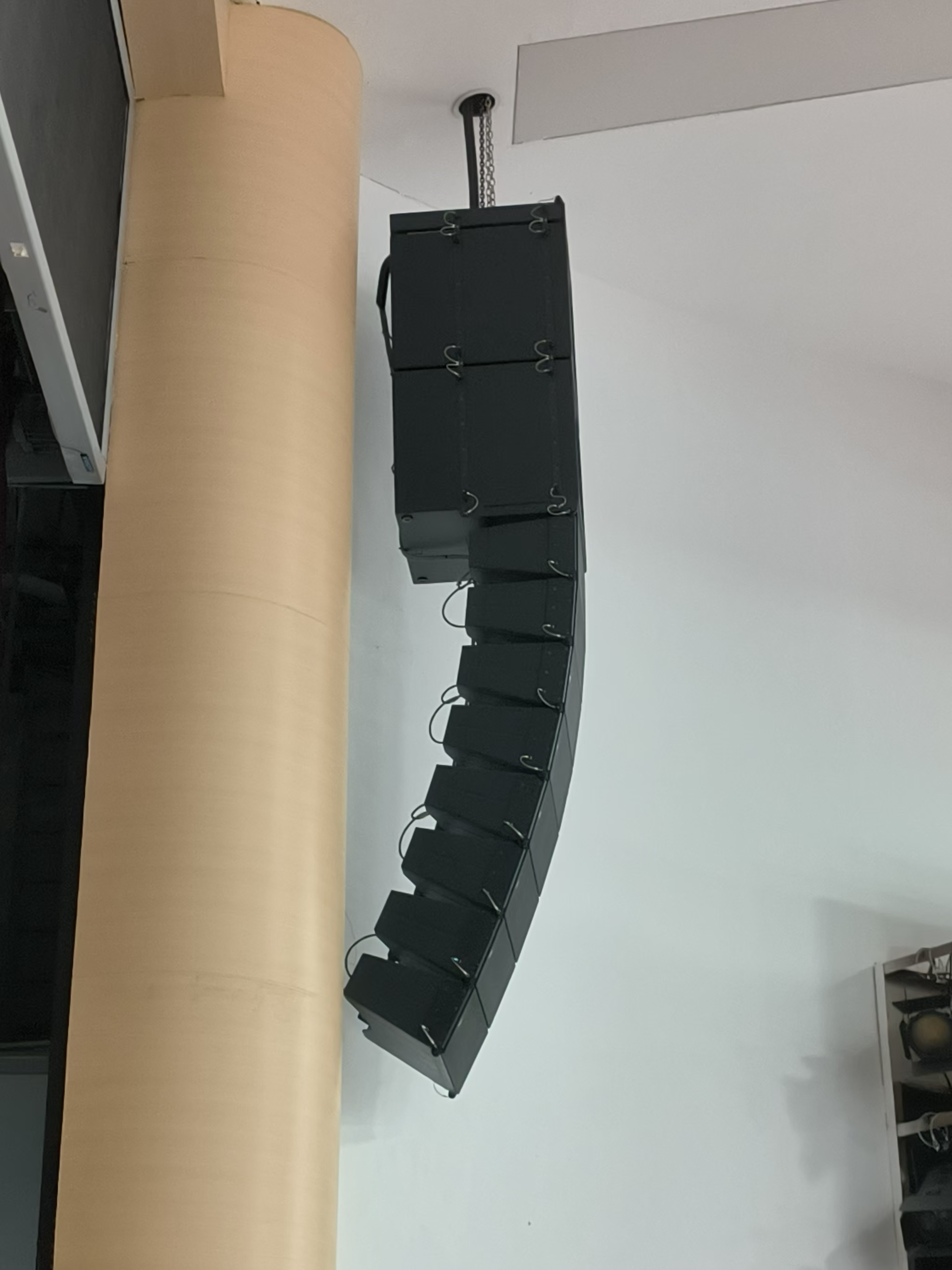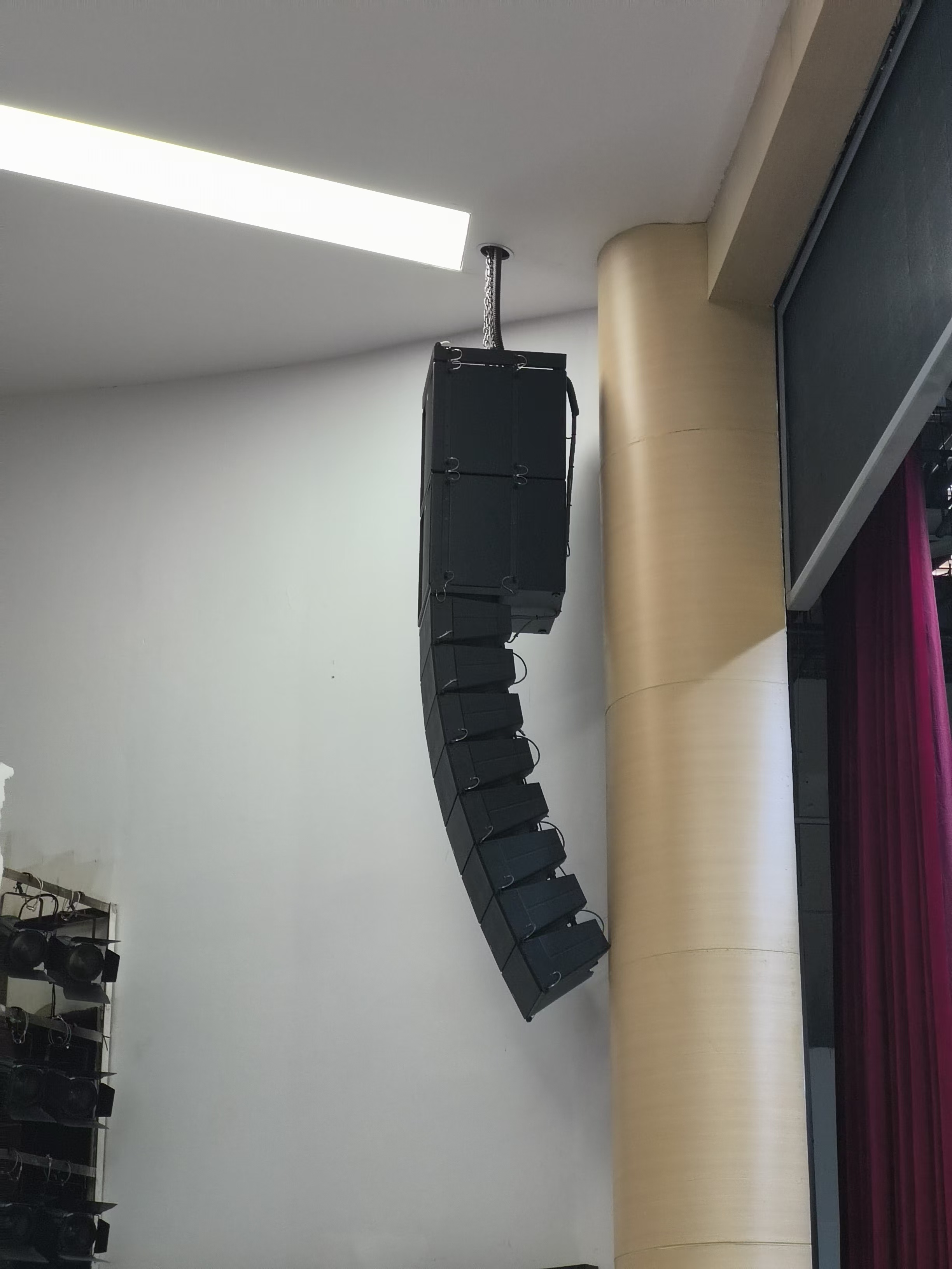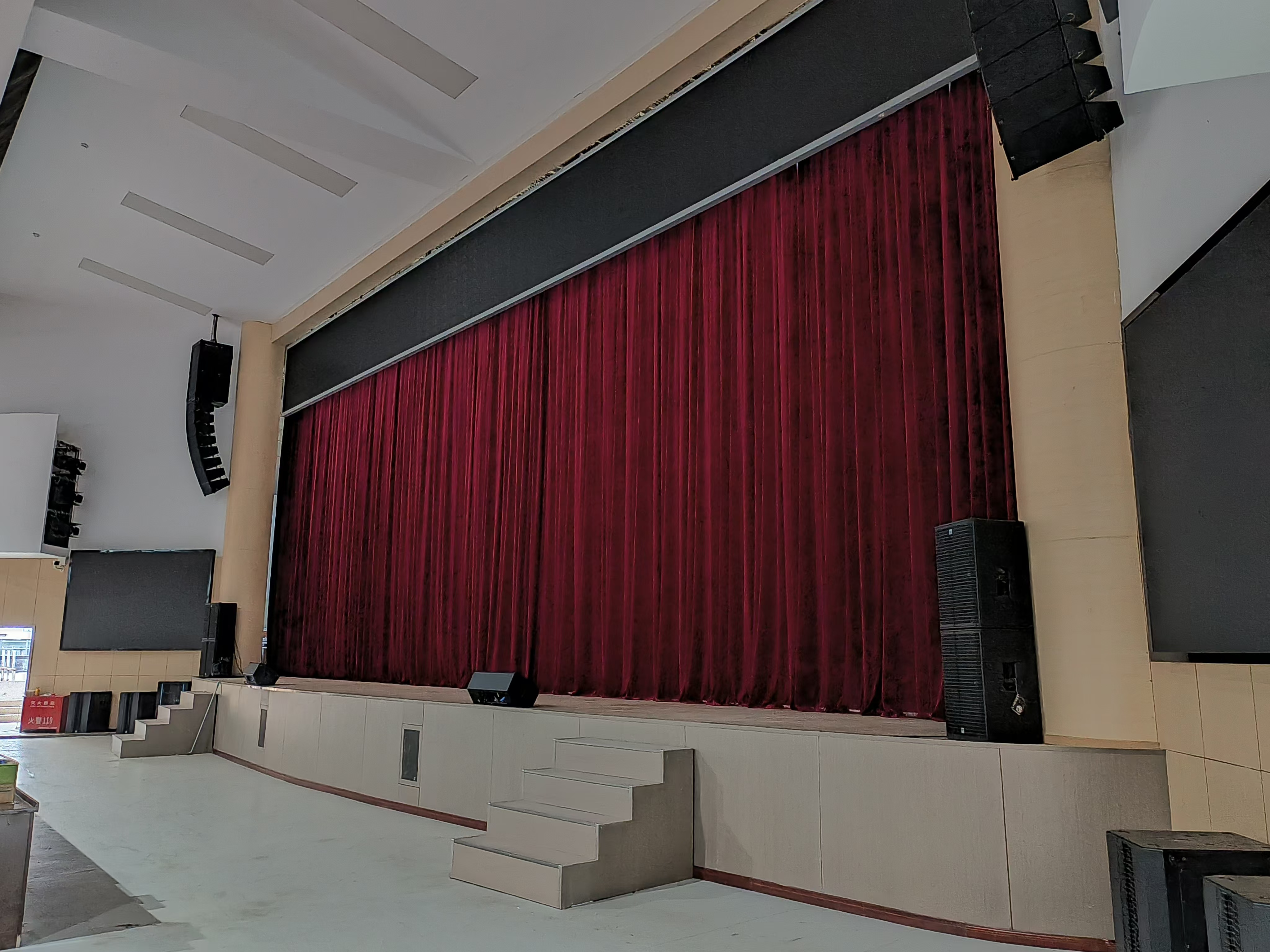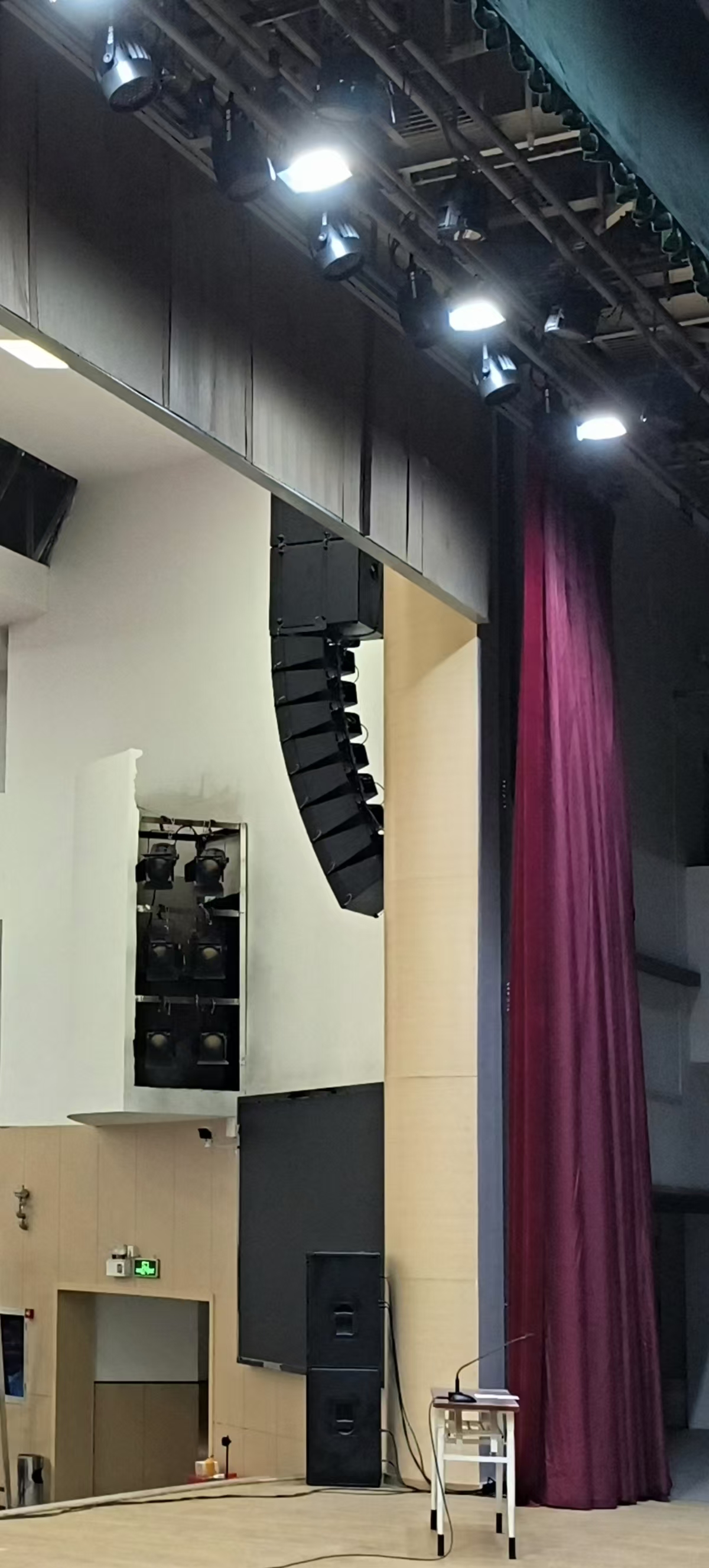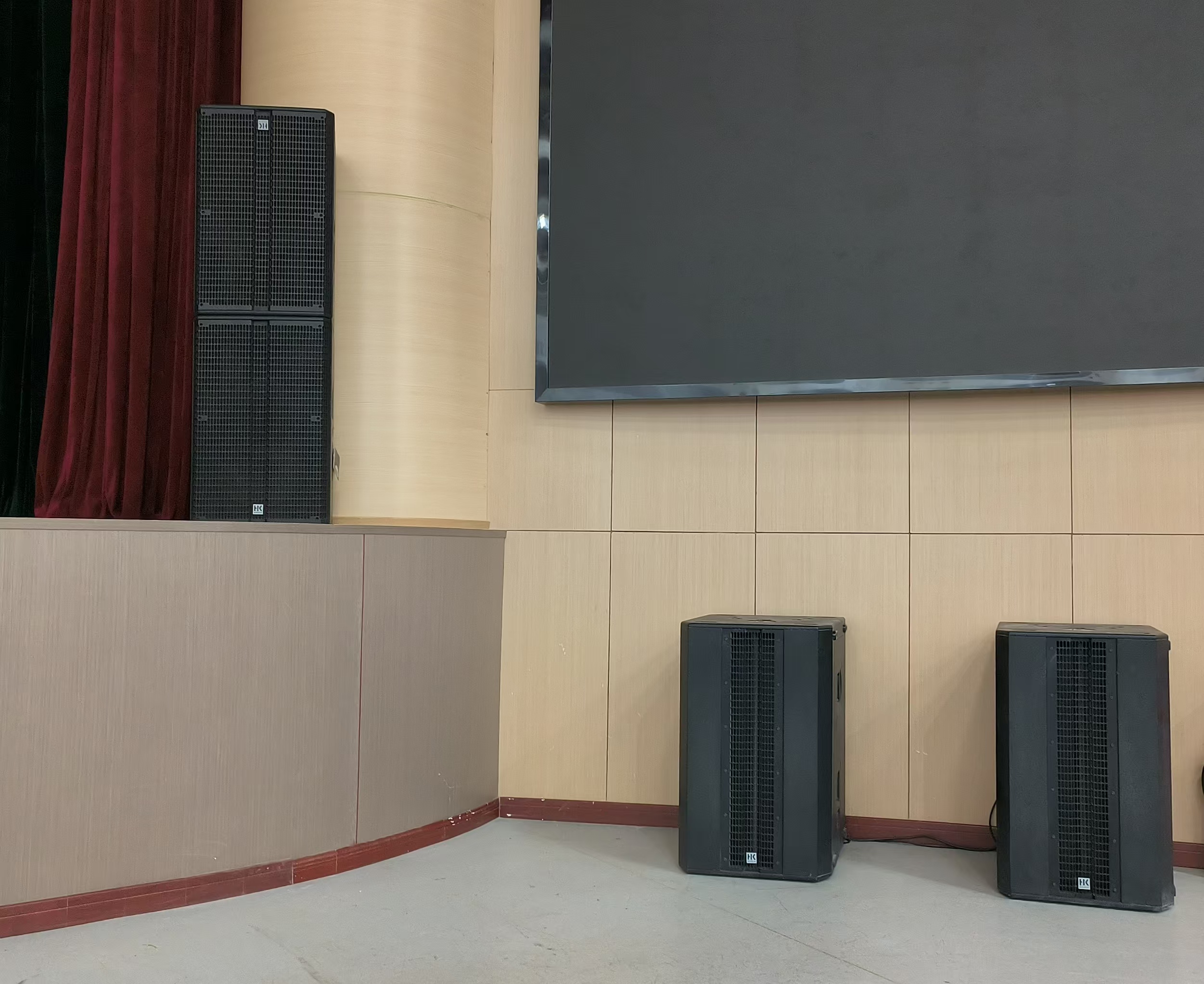 配置的下拉声像音箱组由台口左右拉声像全频扬声器以及左右声道超低频扬声器组成。拉声像全频扬声器使用了2只hkaudio公司的linear 5 115 f音箱同时使用了linear系列的linear sub 2000超低频扬声器用以提升系统的低频下限。